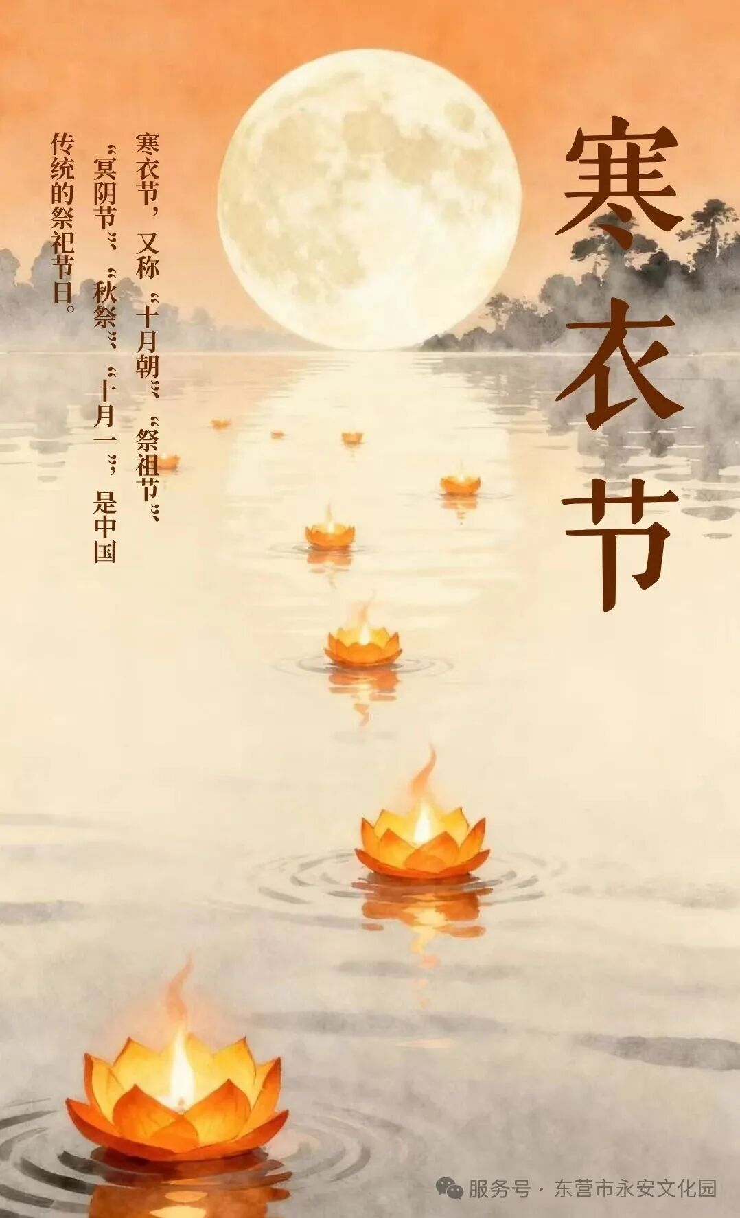 本月20日,暨农历十月初一寒衣节,又称“十日朝”,“祭祖节”等,是中国传统的祭祀节日之一。 寒衣节起源于周朝,《诗经·豳风·七月》曾提到“七月流火,九月授衣”,意思是农历九月以后天气逐渐转凉,人们开始为过冬添置御寒的衣物,也是为逝去亲属送御寒衣物的日子。 当代社会人们可以选择的祭祀方式有很多,可以通过送鲜花、写祭文等多种方式缅怀亲人,表达哀思。 寒衣节不仅是对逝者的缅怀,也是生者对生命的敬畏和对未来的祈愿。在这个特殊的日子里,我们用温暖的方式连接过去与现在,让爱和思念跨越时空,永远相伴。 园区提供代客祭扫和鲜花祭扫服务。 服务电话:8092290